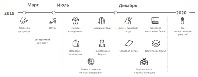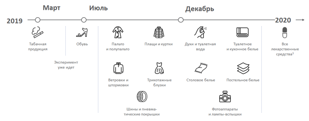 Этапы введения маркировки для различных групп товаров утверждены Распоряжением Правительства от 28.04.2018 № 792-р: